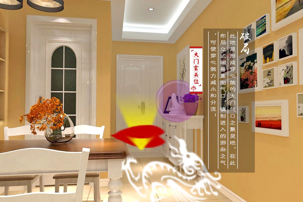 3、化穿心煞之害。1点位置是大门玄关之位,是形成穿心煞的大门气口之聚灵地,在此布局立式瑞兽直面气口,镇制进入的邪杂之气,可使穿心煞力减小和分流;5点位置是暗权位,在此布局红色花簇摆件,形成第二轮的化煞,并可化从7点位置溢出的晦气对靠山位的影响;