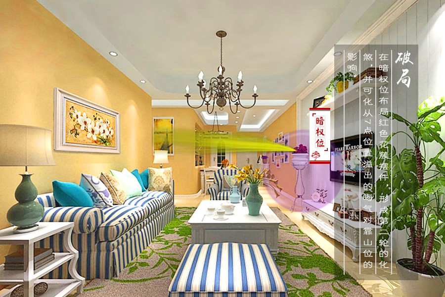 2、靠山位喜聚气忌冲煞,应气纯正而厚实,人居旺位,方才家兴。看开发商的原布局图,将沙发靠山位立于6点位置,这样的布局存在致命问题:靠山位与大门成一条直线,大门是外气之口,力强且杂,并形成穿心煞之势,强杂之气冲煞靠山聚,靠山必不聚气,最终不利家人事业及运势。看新的布局图,风水大师潘非将靠山位移至养气聚气的4点位置;