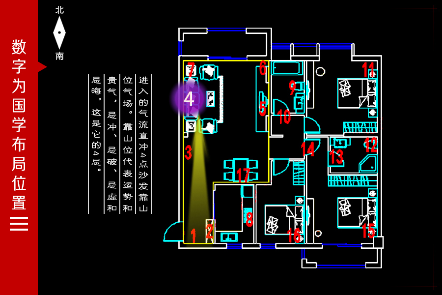 1、1点位置为入户玄关气口之位,是外气聚集之地,本设计中在2点位置布局大象吸财局,在1点布局福字画匾,在此布局的目的是化制进入的煞气,引入在门口徘徊的旺气;