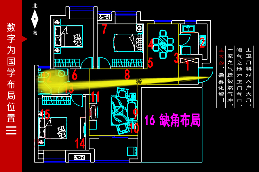 1、本户型为缺失16点位置的巽卦位气场,卦位主对长女不利,且缺失严重,需要补卦气;