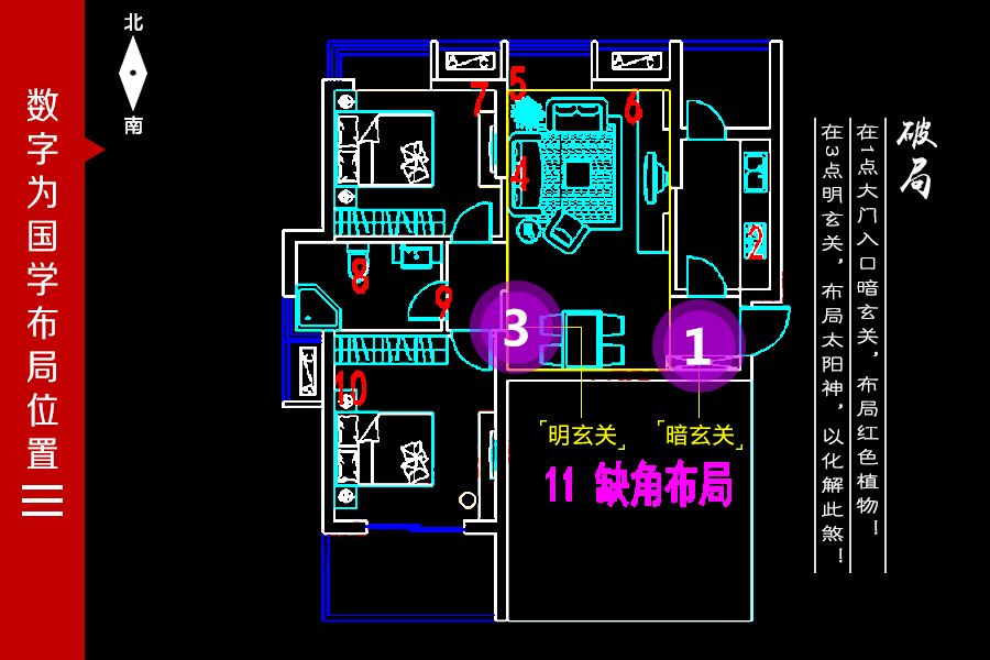 2、大门冲餐厅。大门直冲餐厅,对财运不利。餐厅是家人吃饭的地方,餐厅对着大门不仅给健康带来影响,还会影响到餐厅积聚财气。破局:1点位置是大门入口暗玄关,布局红色植物;3点位置是本户明玄关,布局太阳神,以化解此煞;3、厕所冲大门。看楼盘户型图,大门气口与厕所门呈一条直线,换句话说就是厕所门冲煞大门,大门气口同时被破,被冲和被晦,三大忌全中,实乃大忌中的大忌!破局:只须在3点位置布局一道玄关,阻挡厕所气口冲抵大门,就可化解此煞。