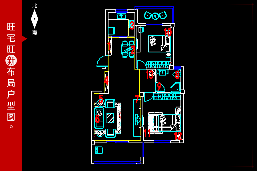 看新的布局图,国学大师将靠山位移至6点位置,这样的布局在此透露一个风水秘诀:风水讲求围合聚气,气盛必家旺。客厅是家人聚会的地方,承载着家人的气场因子,国学布局后的沙发靠山位墙面与5点位置的墙面形成一个半围合式的区域空间,有利于家人旺气的汇合与聚集。