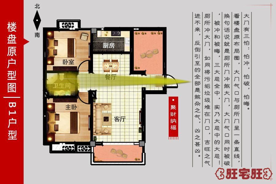 看楼盘原布局图,大门气口与厕所门呈一条直线,换句话说就是厕所门冲煞大门,大门气口同时被破,被冲和被晦,三大忌全中,实乃大忌中的大忌!厕所冲大门,如同将污垢垃圾堆在门口,吉旺之气进不来,反倒引至的全部是煞杂之气,凶之甚凶。