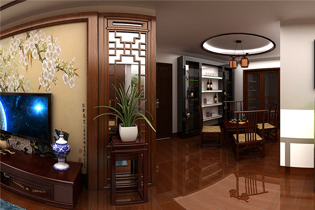设计理念:本设计为中式风格,原木色约带红木色是其创意的最大特点,古朴端庄,摆设考究,适合具有较深文化涵养的人士居住。8点暗财位被两个厕所晦气所困,以莲年有余画匾化煞,在3点旺财位布局鱼缸以作催财增旺之用,4点位置为靠山位,布局扇匾配合中国结作为靠山位及化煞,也可布局有水潭的高山流水画匾配中国结催生财丁。